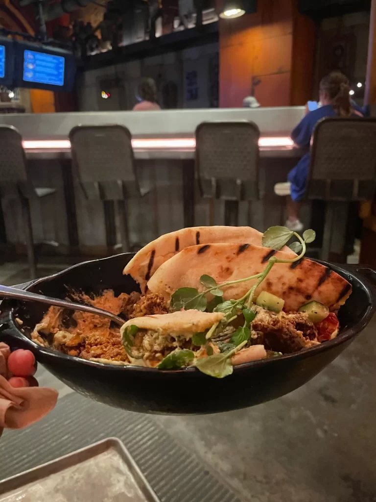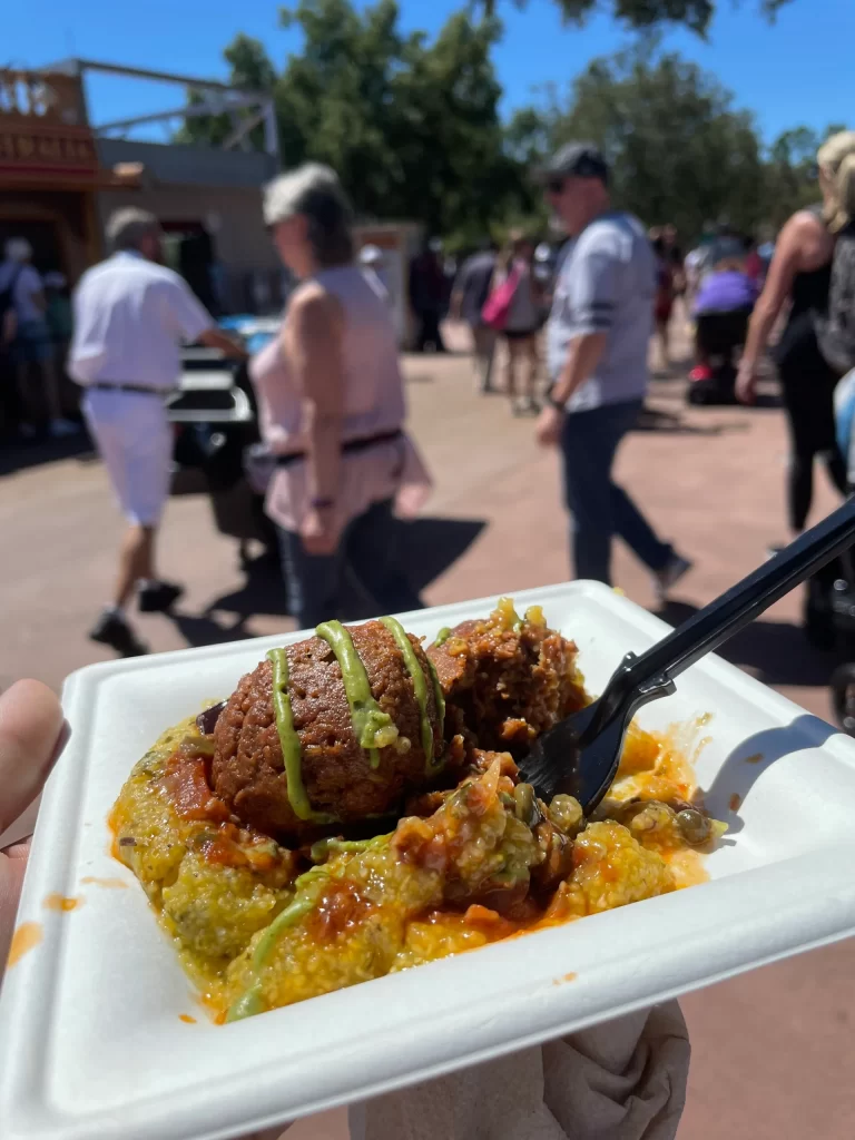 NO! Not at all! The curated plant based menu items Disney already has on their menus have always impressed me. The picture above is the Felucian Kefta and Hummus Spread from Docking Bay 7 in Star Wars Galaxies Edge. This dish is Impossible Meat mixed with Quinoa and spices on a bed of hummus, topped with tomato and cucumber relish with large pieces of pita bread. It has a great spice and flavor and the elements really mix well together. You can find a plant based Ronto Wrap over in Ronto Roasters in Galaxies Edge for lunch and breakfast as well! These are examples of more adventurous options, what about those of you out there that aren’t so adventurous with their food and kids?!