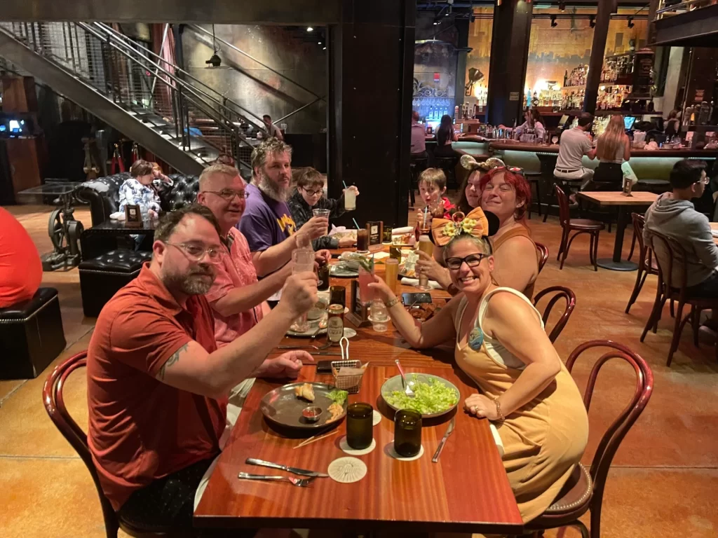 After homework we headed over to Disney Springs to celebrate with friends at The Edison. Disney Springs at night is my favorite! There are bands playing all over the place, singers in the bars and restaurants and just a fun family atmosphere. We went a little early and stopped to listen to the band playing by the Boathouse. Thatcher loves this too and he danced his heart out for a good half hour before we headed to dinner.